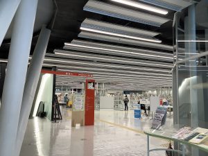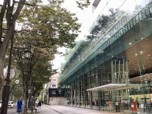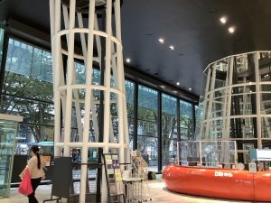 透ける外観、そこに見えるチューブと呼ばれる配管や縦動線。近未来的に見えるかもしれないが、目の前の定禅寺通りの並木と一体に見えて気持ち良い空間になっていた。